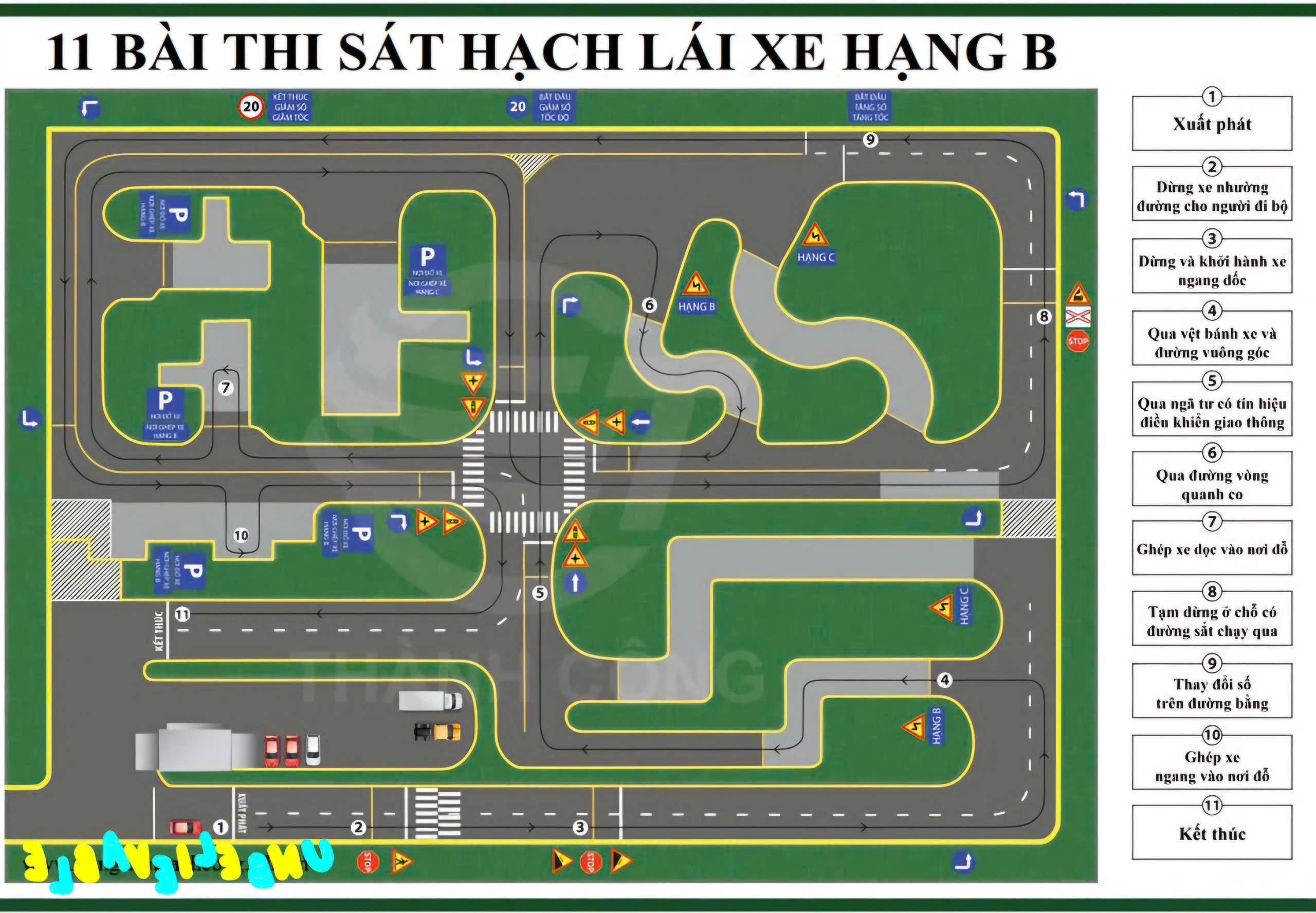 Chương trình bao gồm 11 bài sa hình, thực hành trên sân theo tiêu chuẩn của Bộ GTVT.
